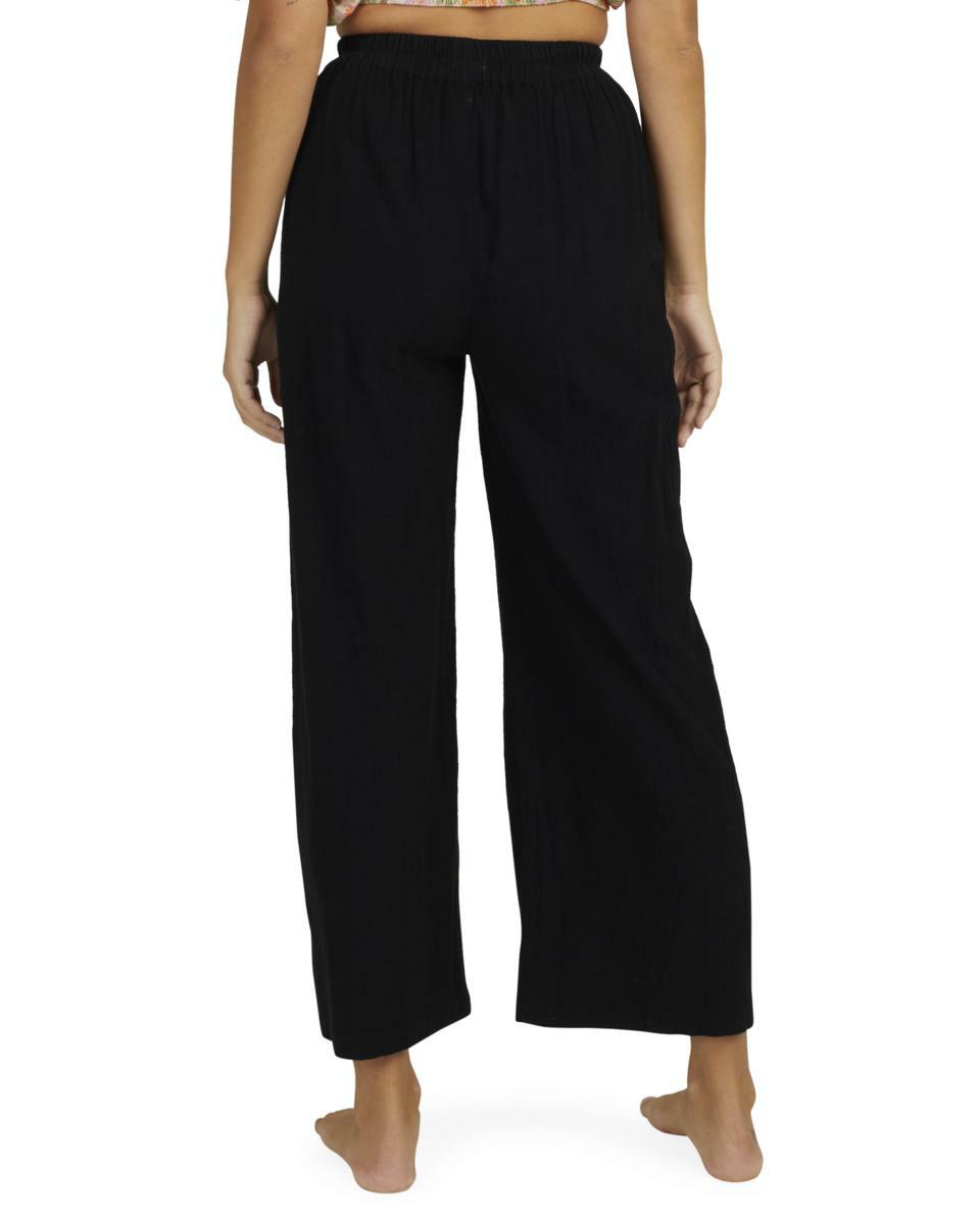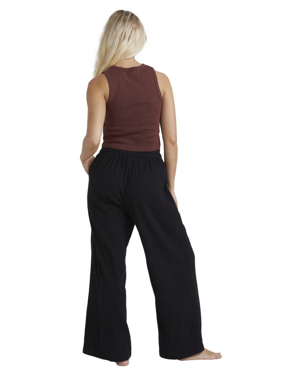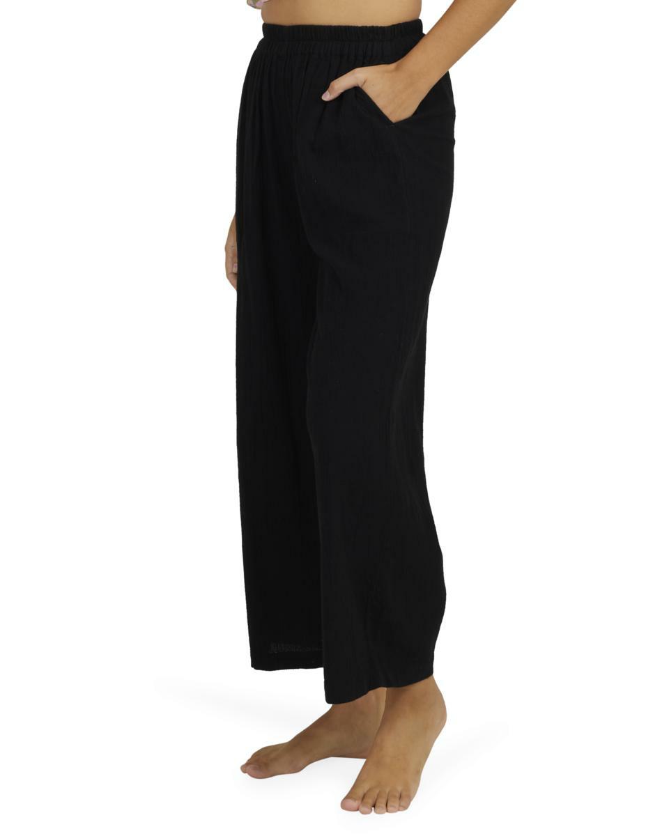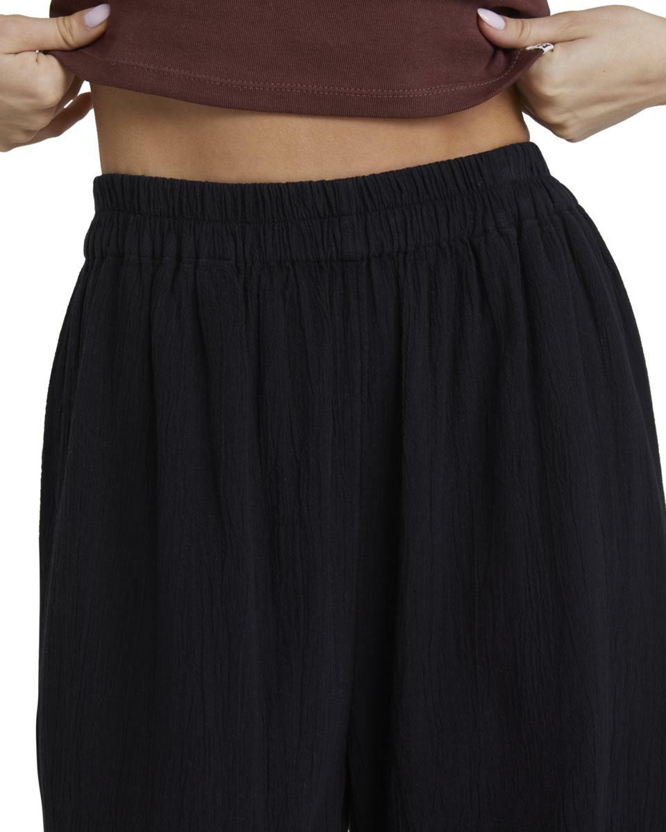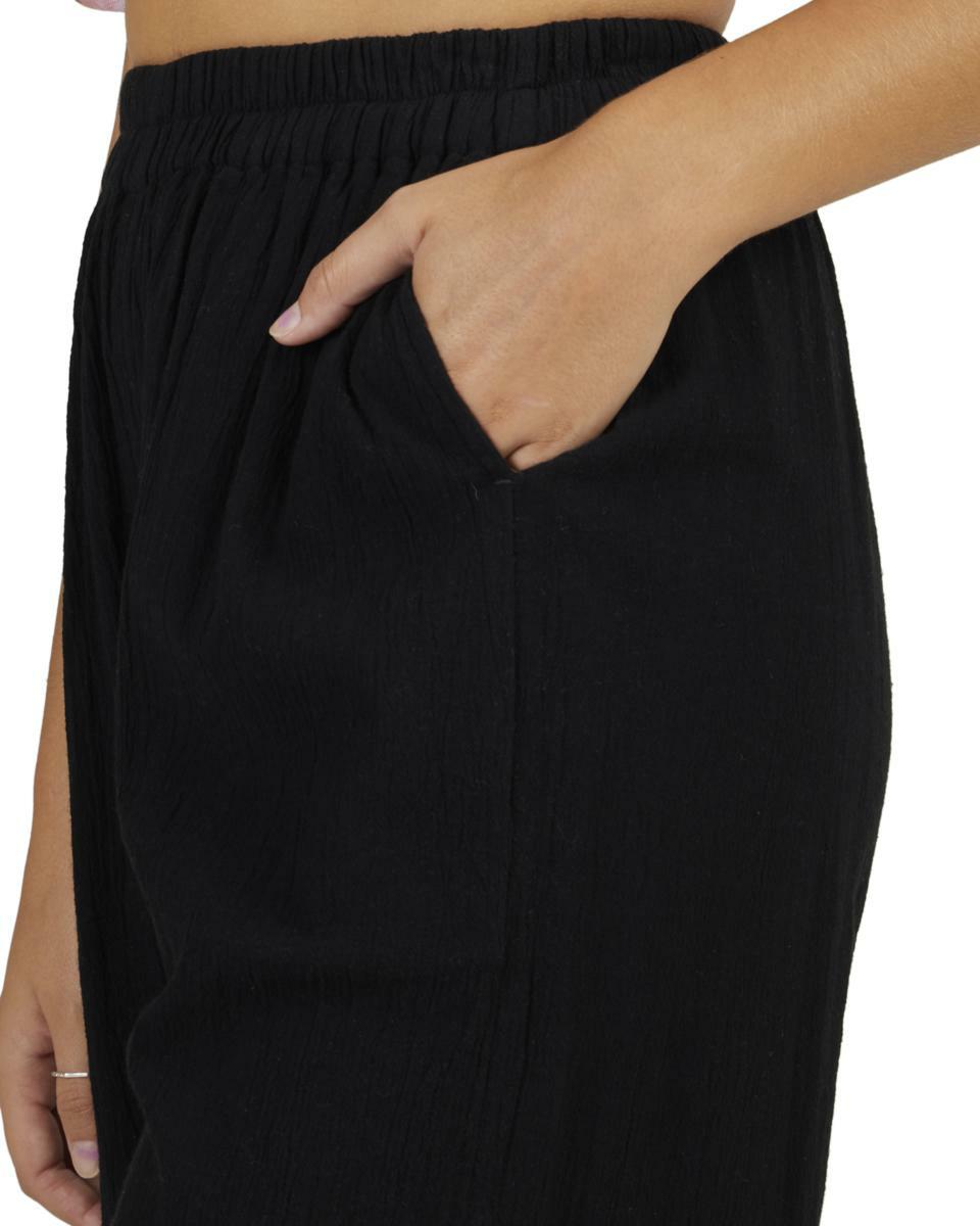 Features:Cotton linen gauze blend fabricRelaxed fitMid riseElastic waistFixed closureSide pocketsMetal plate.