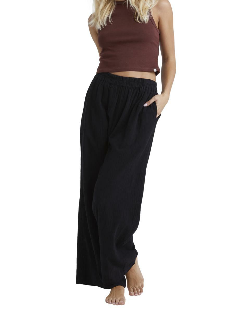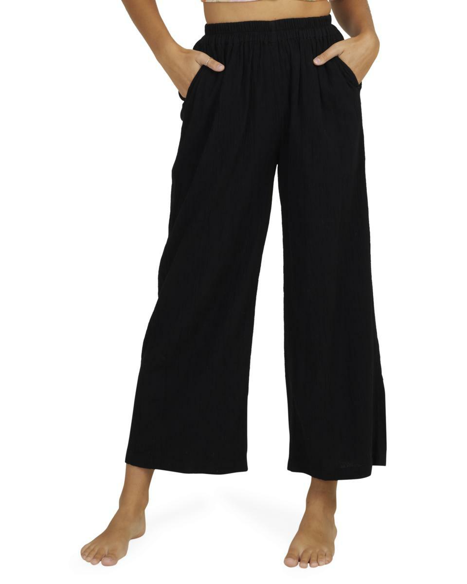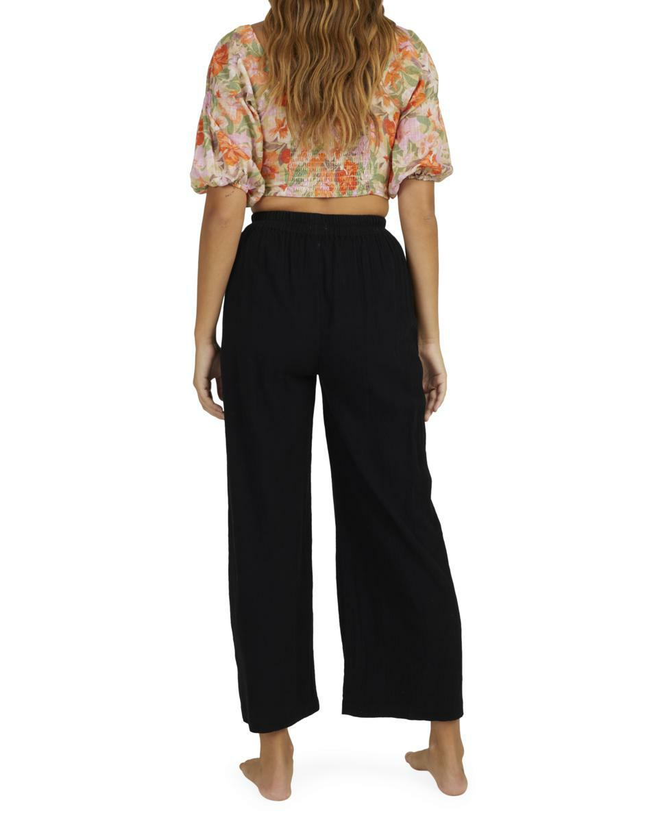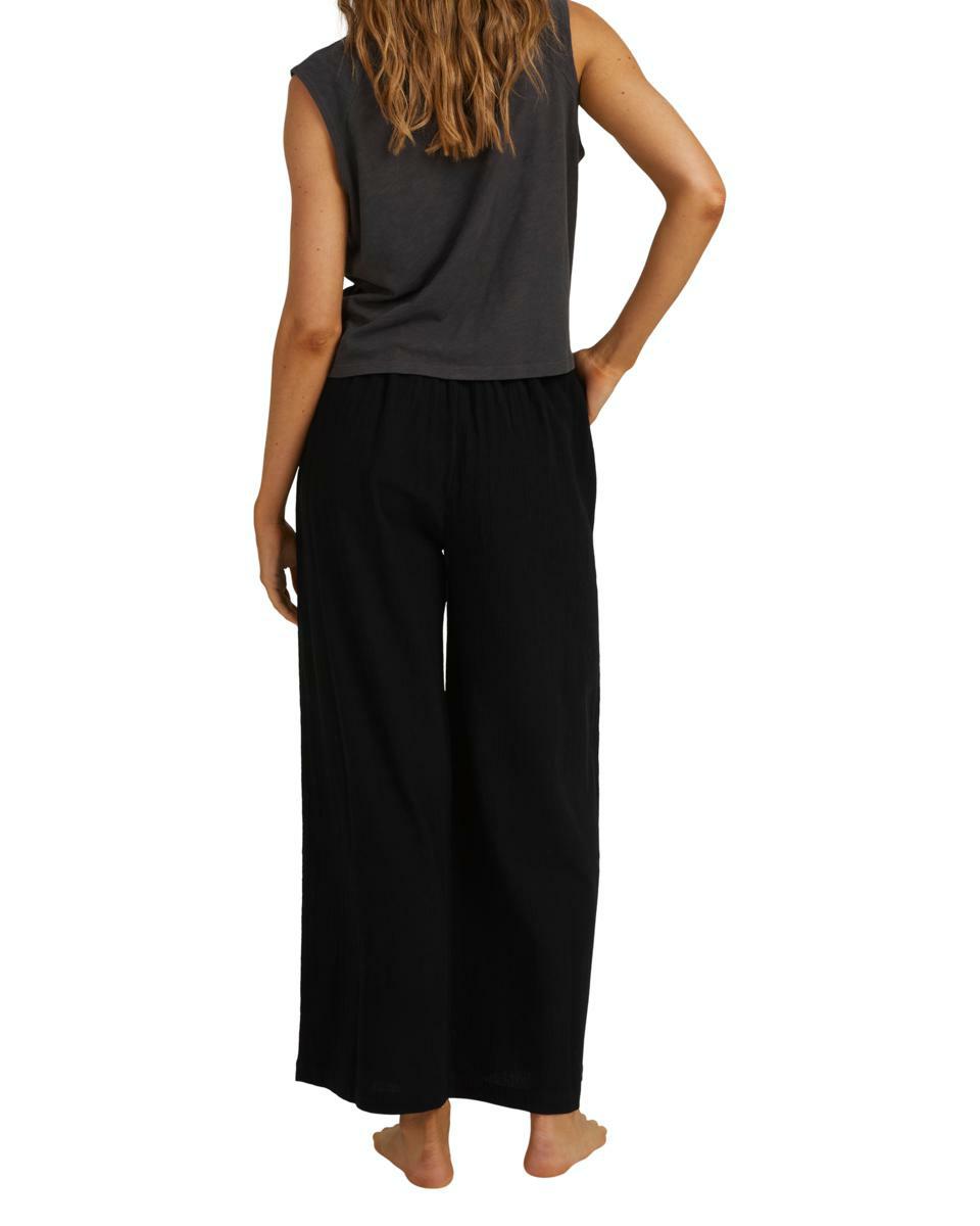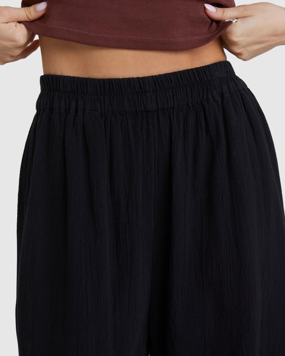 Features:Cotton linen gauze blend fabricRelaxed fitMid riseElastic waistFixed closureSide pocketsMetal plate.