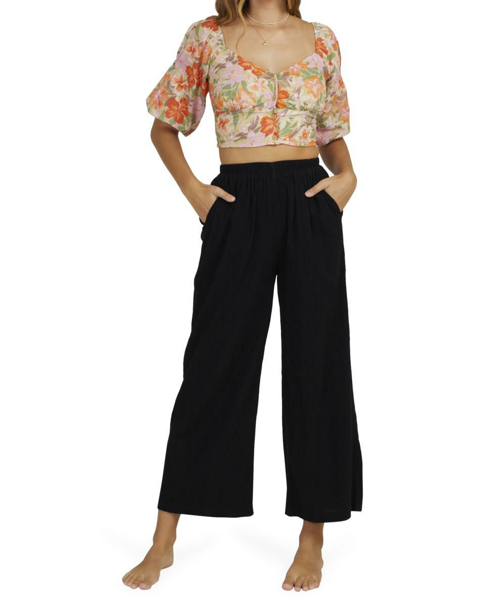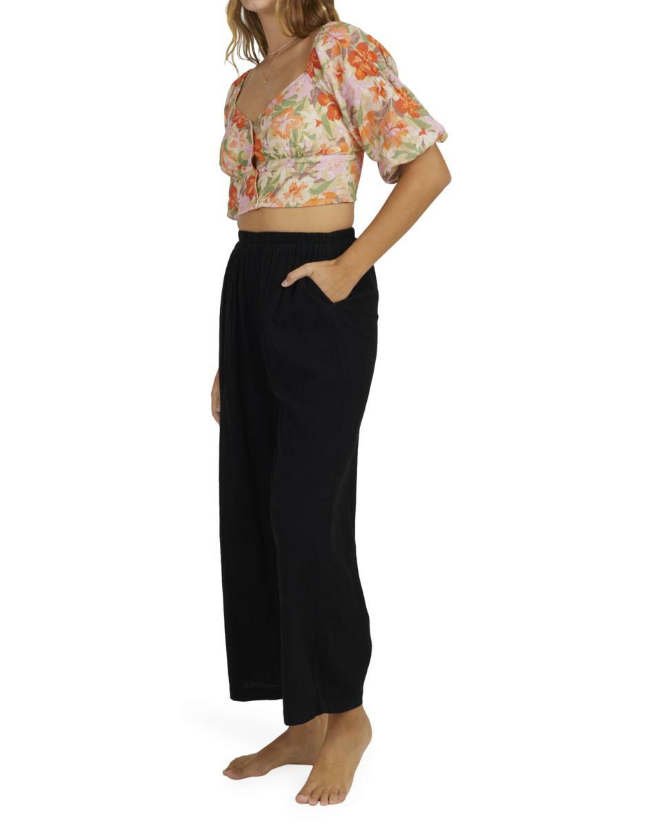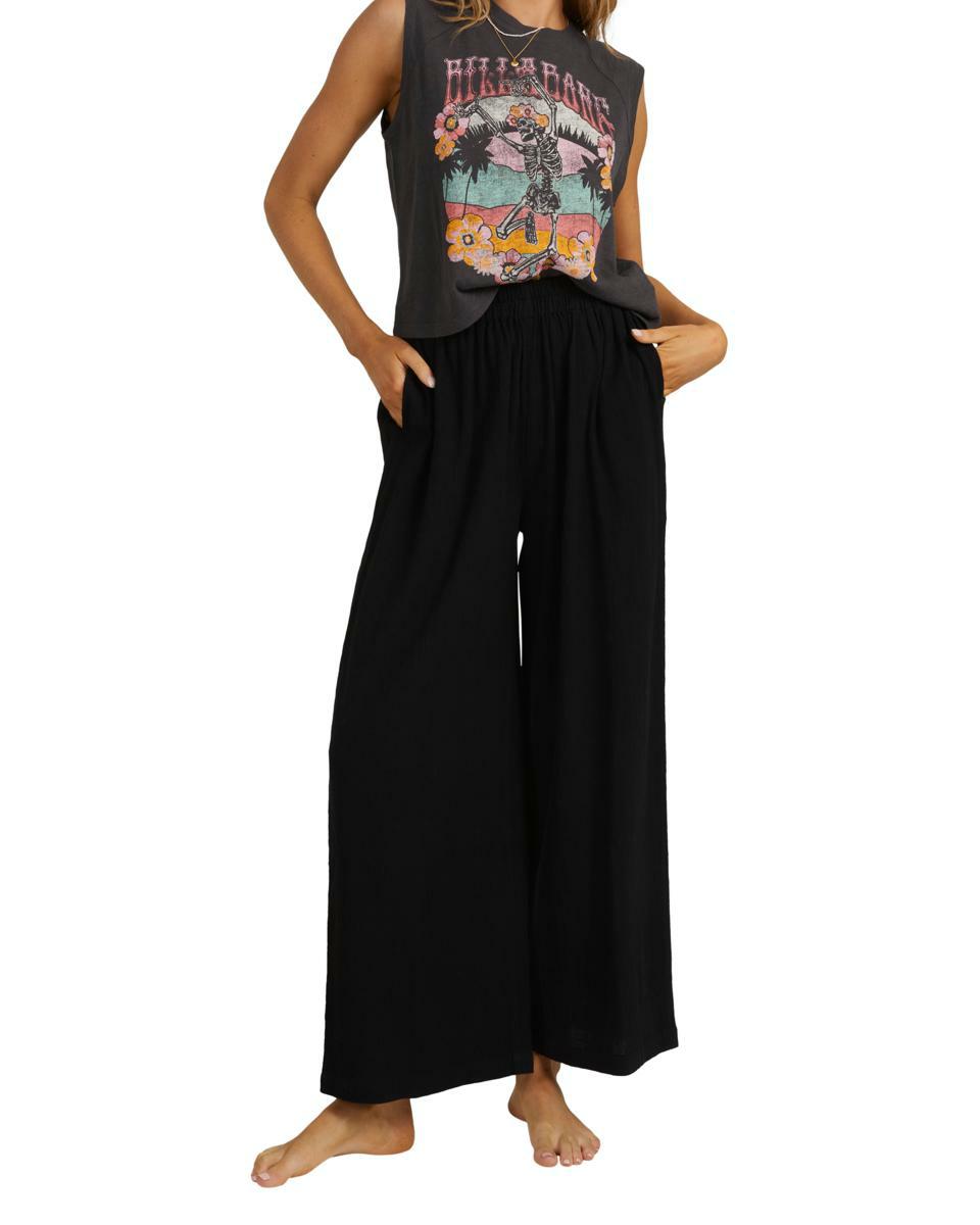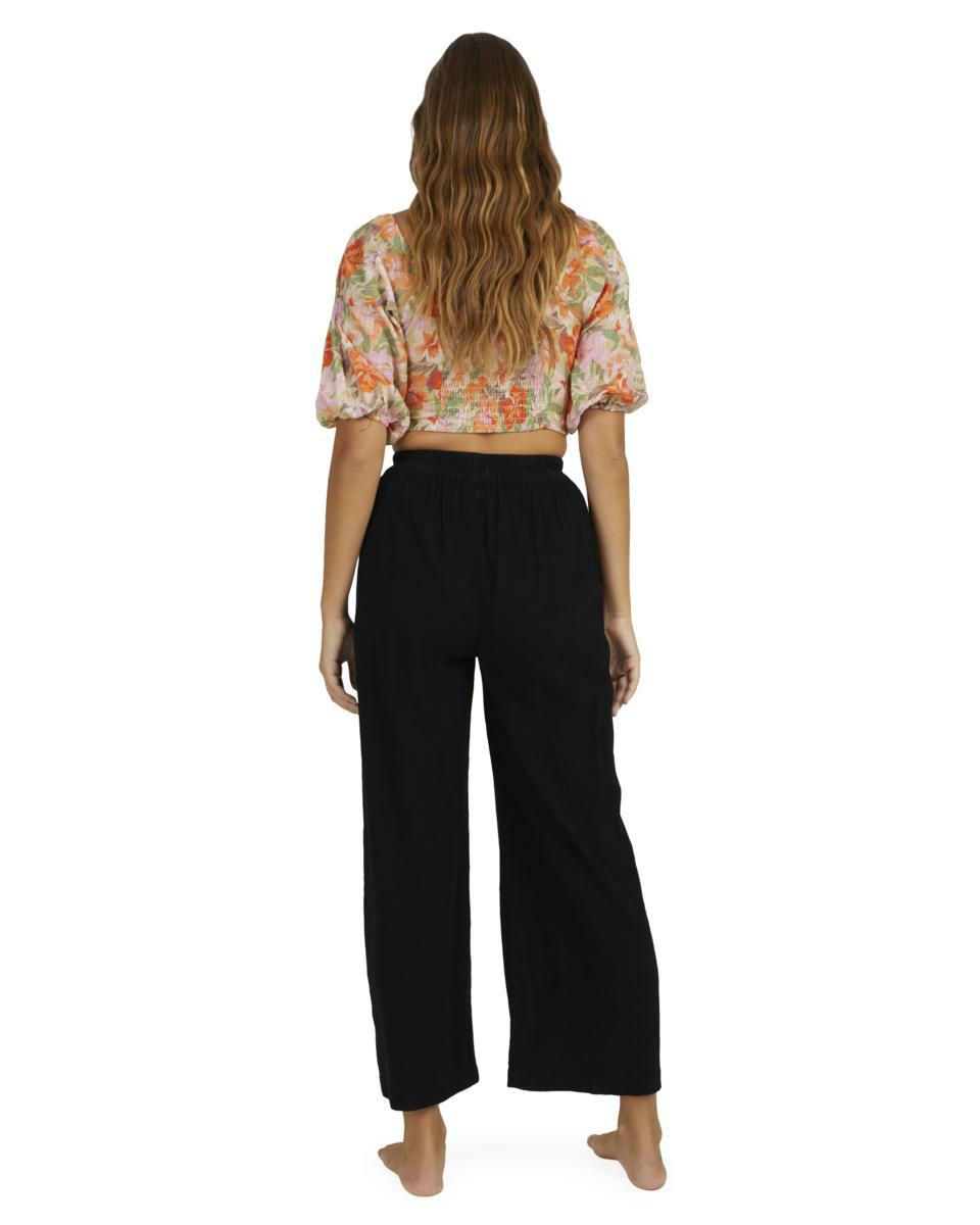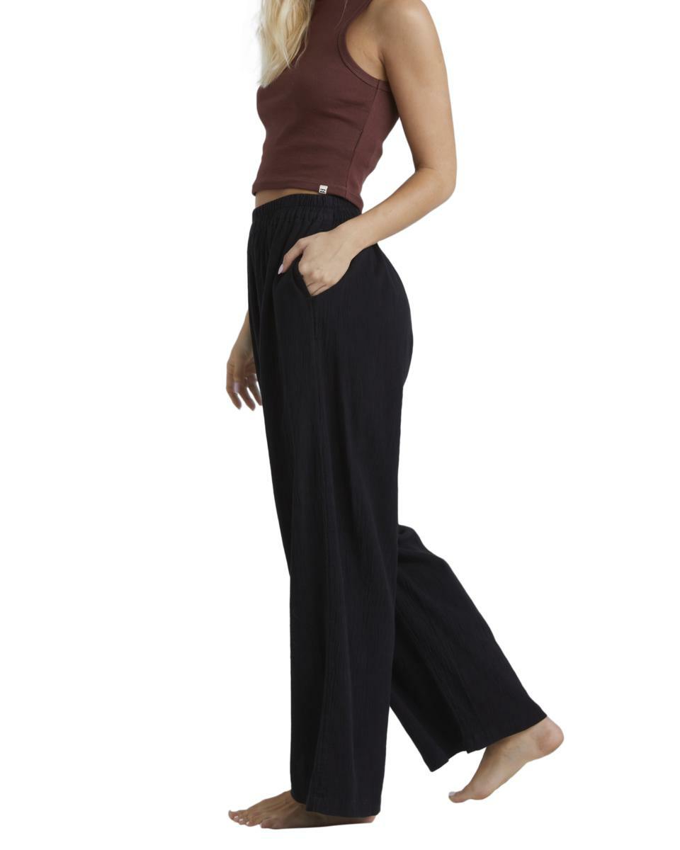 Features:Cotton linen gauze blend fabricRelaxed fitMid riseElastic waistFixed closureSide pocketsMetal plate.